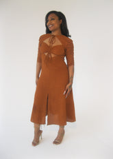 The Joanna is our most figure flattering and timeless style, designed to take you from day to night with ease. This midi A-line silhouette gracefully skims over your curves and flatters a multitude of body types. Crafted from high quality materials, this dress features a flowy and lightweight textured fabric that drapes beautifully. The dress strikes the perfect balance between sexy and demure with its center front slit and the surprise back cut out. Joanna’s versatility ensures that it will be a staple in your wardrobe throughout the seasons.
